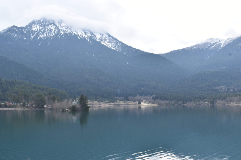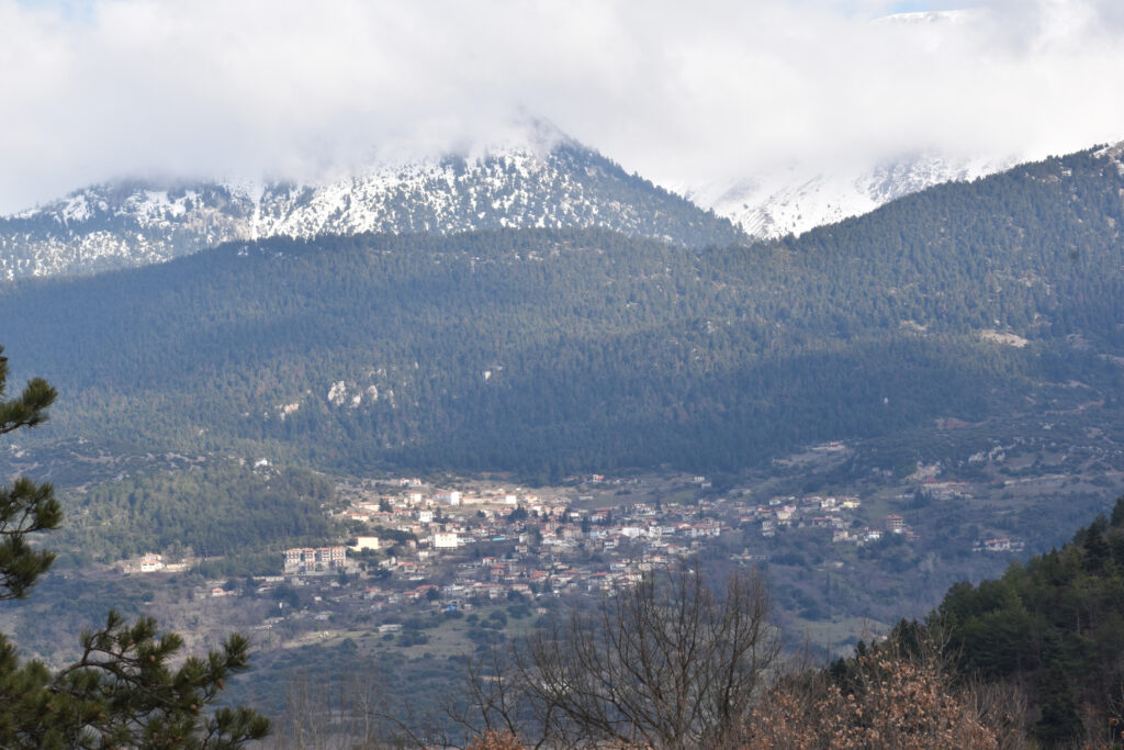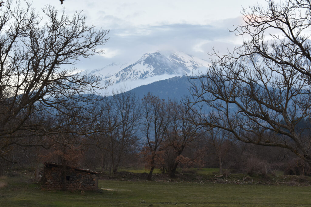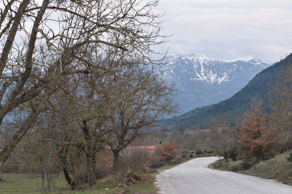 Ο δρόμος που ενώνει τα Καλύβια με το Μεσινό είναι γραφικότατος. Μεγάλες καρυδιές και καστανιές μπλέκονται με βοσκοτόπια και σπαρτά χωράφια. Ύστερα περνάς την «προσωρινή» μεταλλική γέφυρα του Ολβίου και βρίσκεσαι στο Μεσινό. Είναι ένα άχαρο χωριό κτισμένο το μισό επάνω στους πρόποδες της Ζήρειας και το άλλο μισό στην πεδιάδα. Μετά πήραμε τον δρόμο πάλι για Γκούρα. Πλέον βράδιαζε αλλά ο ουρανός είχε καθαρίσει από την συννεφιά και μπόρεσα να φωτογραφίσω τα χιονισμένα βουνά σε όλη την μεγαλοπρέπεια τους.
